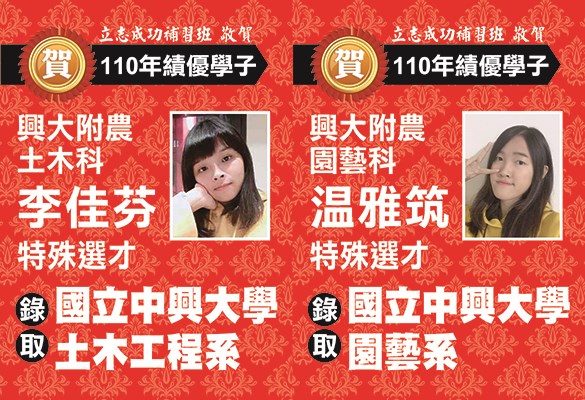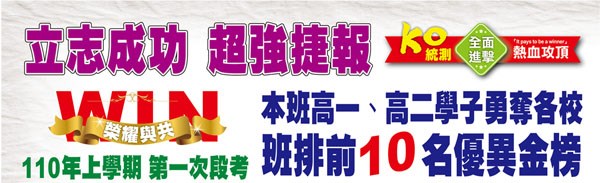 高一領先家教班搶先開課,10月前報名享有早鳥1折試讀價!詳洽立志成功櫃台 高二實力培育班7/15火速開課,現正優惠搶報中! 高三統測金榜班114/7/7全面開課! 展現高分佳績,優惠報名中! 重考國立科大班 重捨信心 保證讓你脫胎換骨!