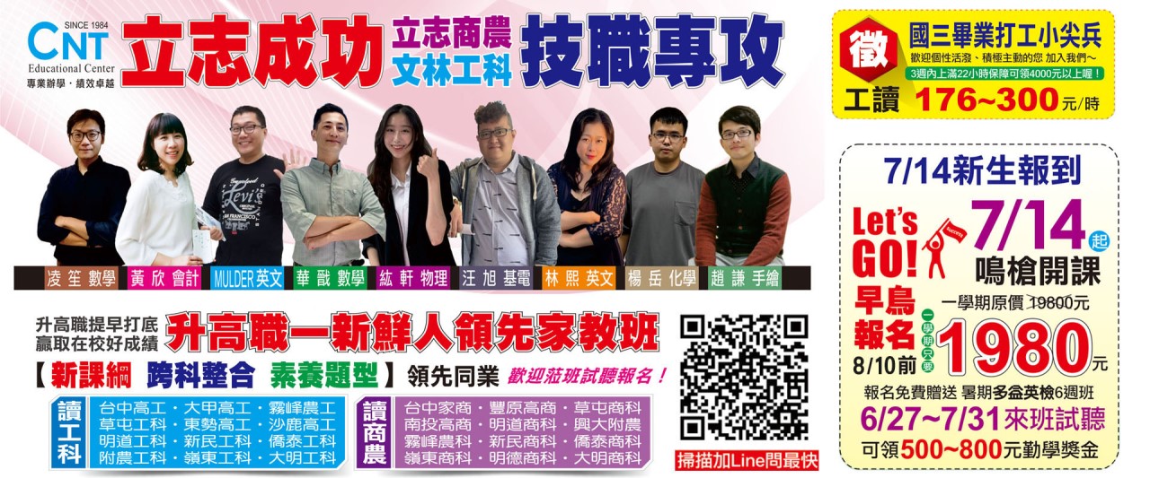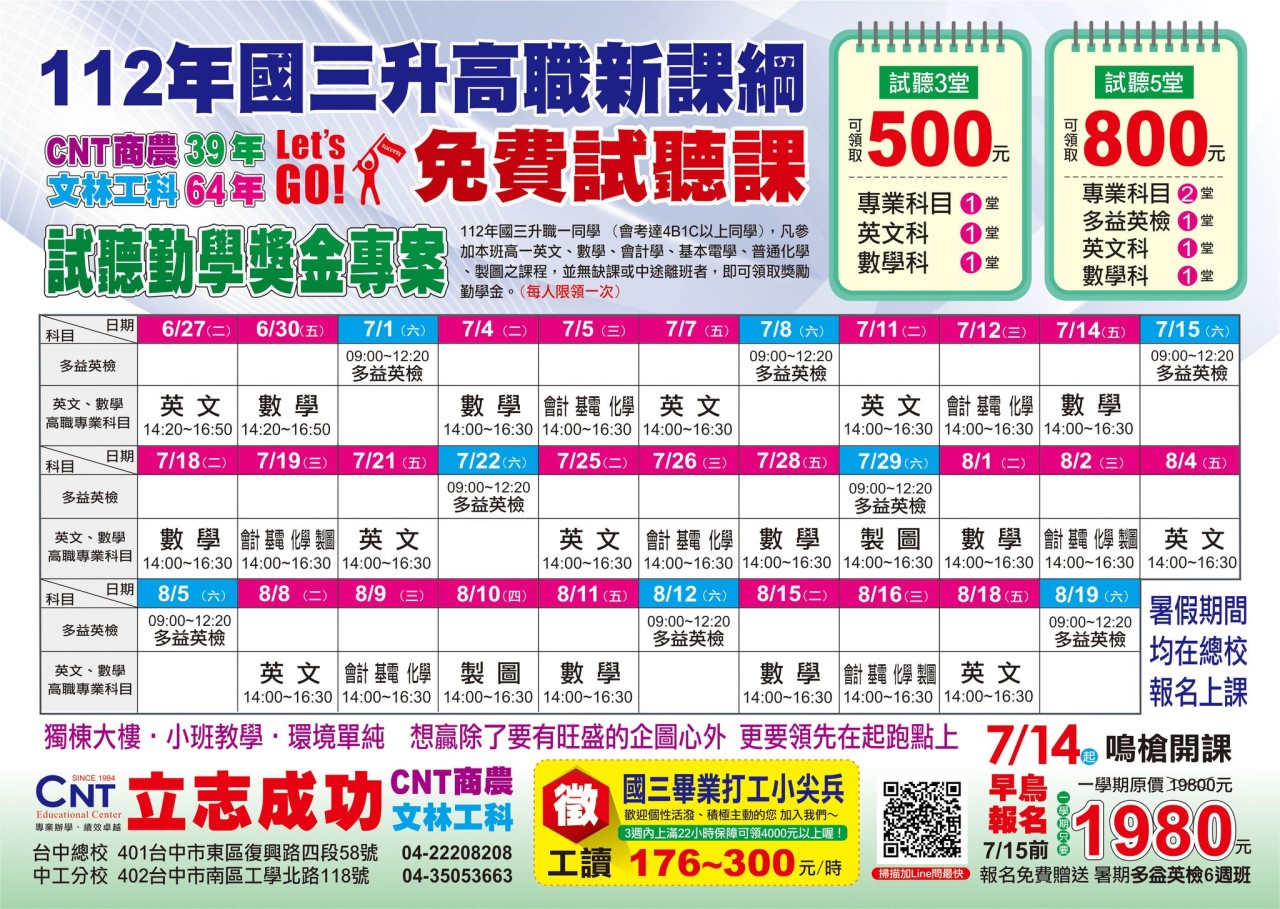 連續試聽3堂課程,憑高職錄取通知單(會考成績限4B1C以上)