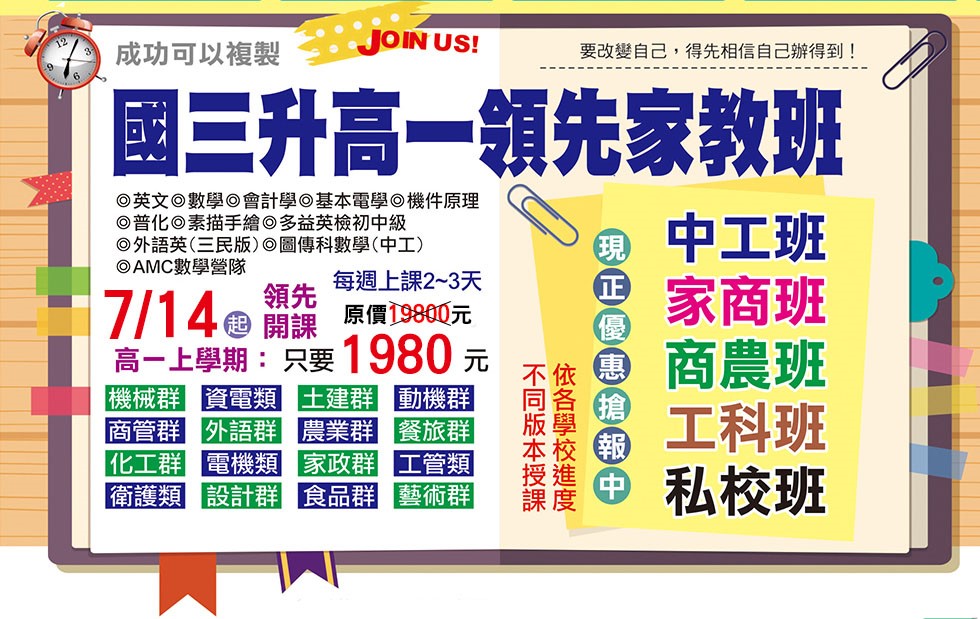 國三升職一 試聽課程火熱上線中,歡迎點此進入! 高二實力培育班7/15火速開課,現正優惠搶報中! 高三統測金榜班113/7/8全面開課! 展現高分佳績,優惠報名中! 重考國立科大班 重捨信心 保證讓你脫胎換骨!