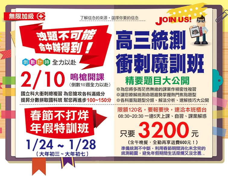 國三升職一 試聽課程火熱上線中,歡迎點此進入! 高二實力培育班7/15火速開課,現正優惠搶報中! 高三統測金榜班113/7/8全面開課! 展現高分佳績,優惠報名中! 重考國立科大班 重捨信心 保證讓你脫胎換骨!